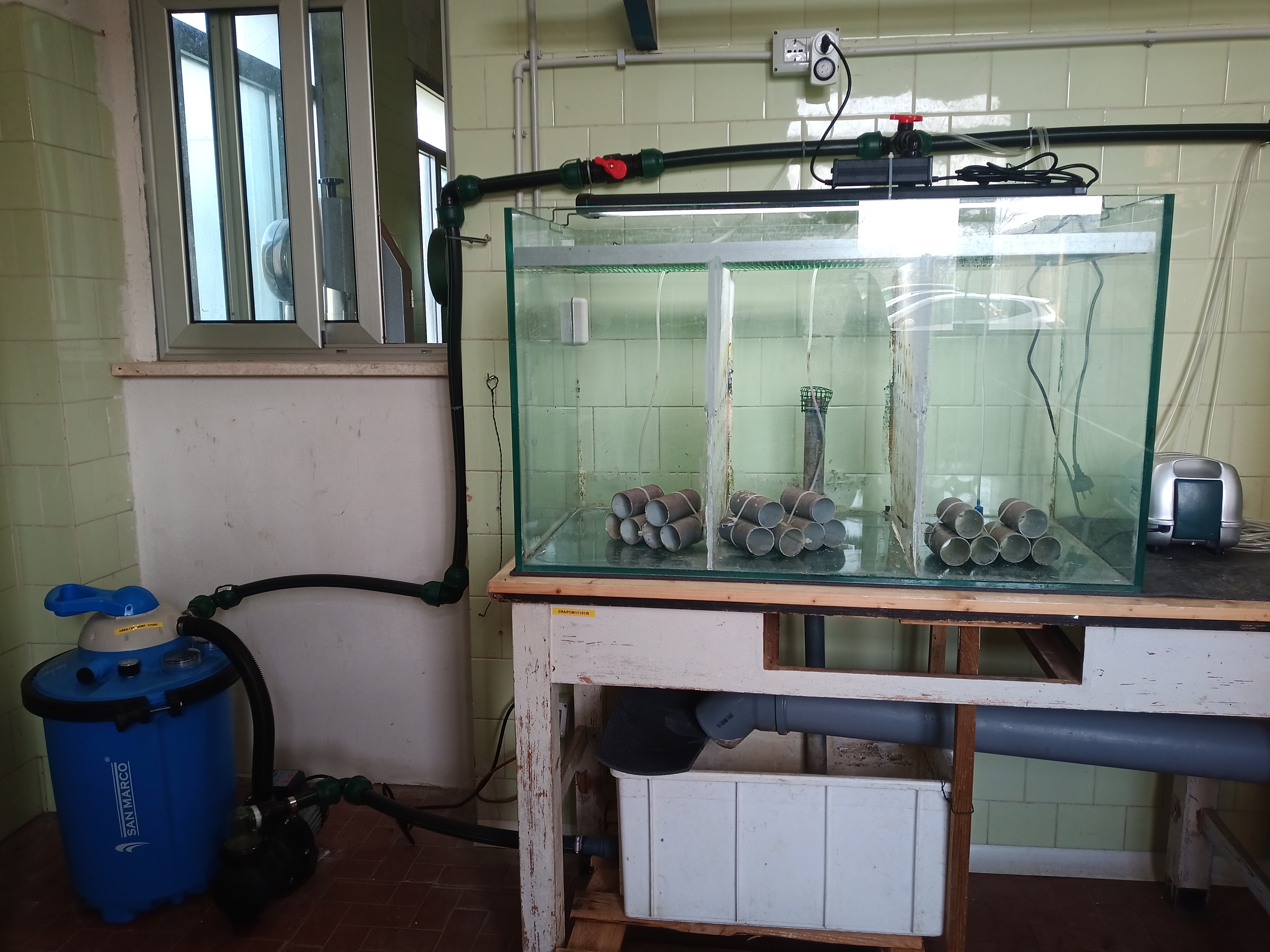 Gli esperimenti volti a verificare l’effettiva efficacia di questo ingrediente, sono stati effettuati in un impianto a circuito chiuso situato presso i laboratori del CREA, composto da 3 vasche in vetro corredate di areazione, filtrazione e illuminazione indipendente.